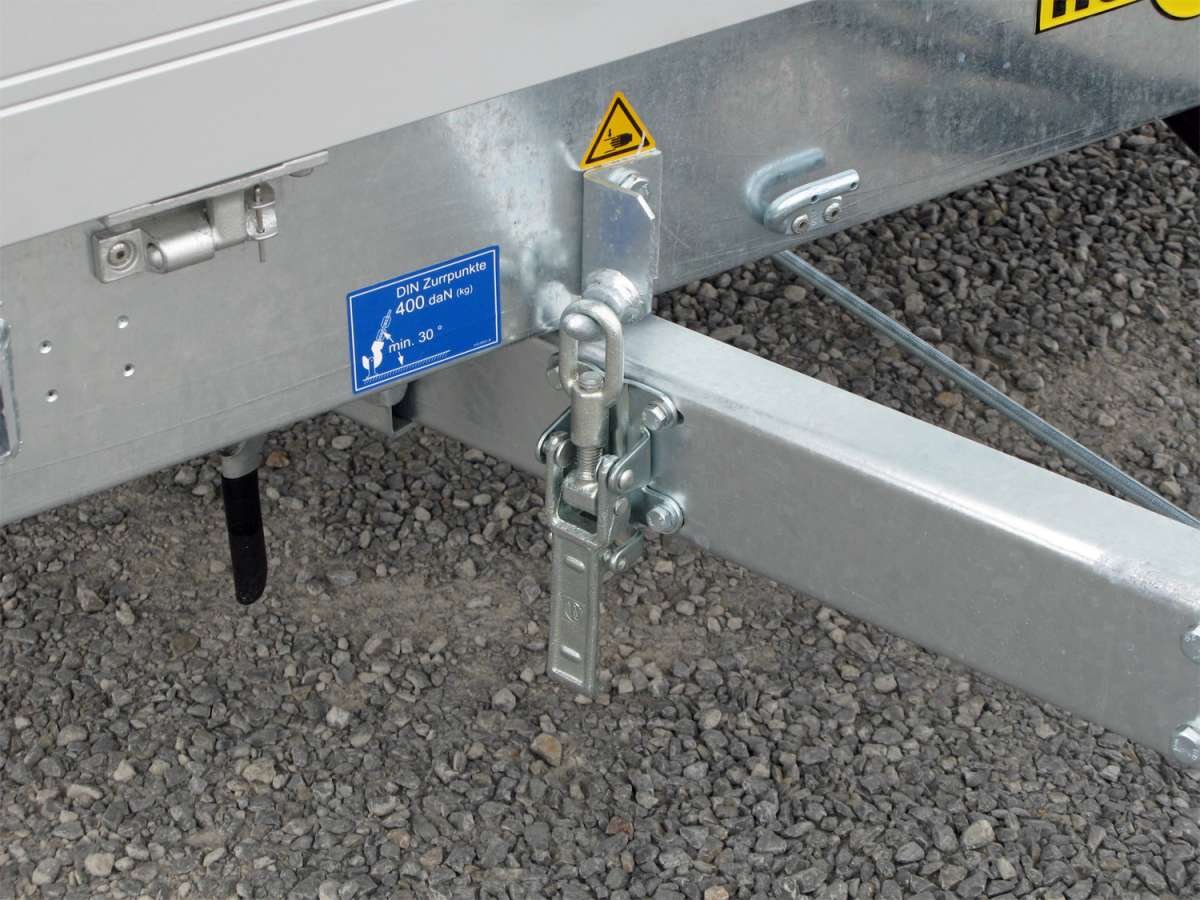 - 8 paires de points d’arrimage dans le cadre extérieur, longueur 4700 mm, chacun avec une capacité d’arrimage de 400 kg, testé par Dekra.