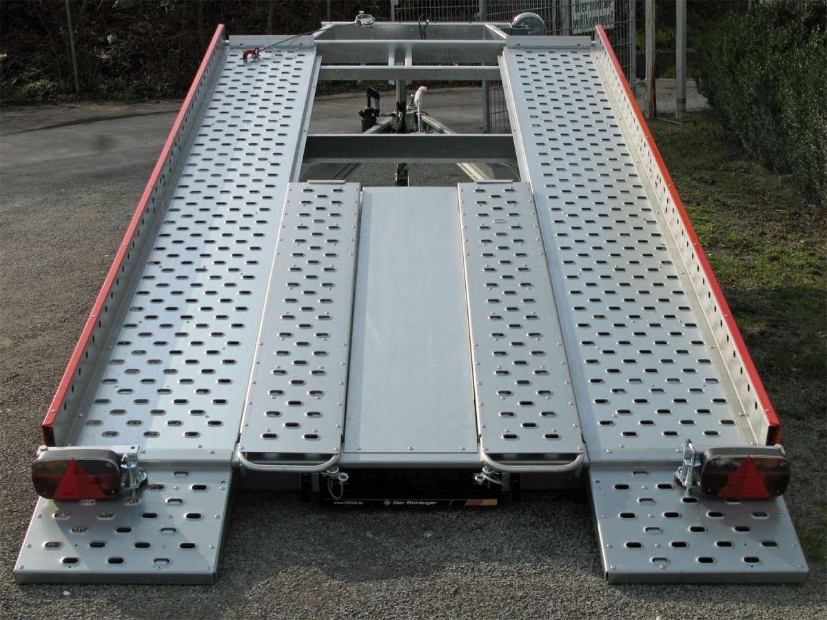 - Rails de guidage extra-larges, perforés et antidérapants, en tôle de zinc, avec de larges trous oblongs pour une fixation sécurisée des sangles de tension. Leur largeur permet le transport aisé de véhicules à empattements différents. Rampes de chargement intégrées facilitent les opérations de chargement et de déchargement.