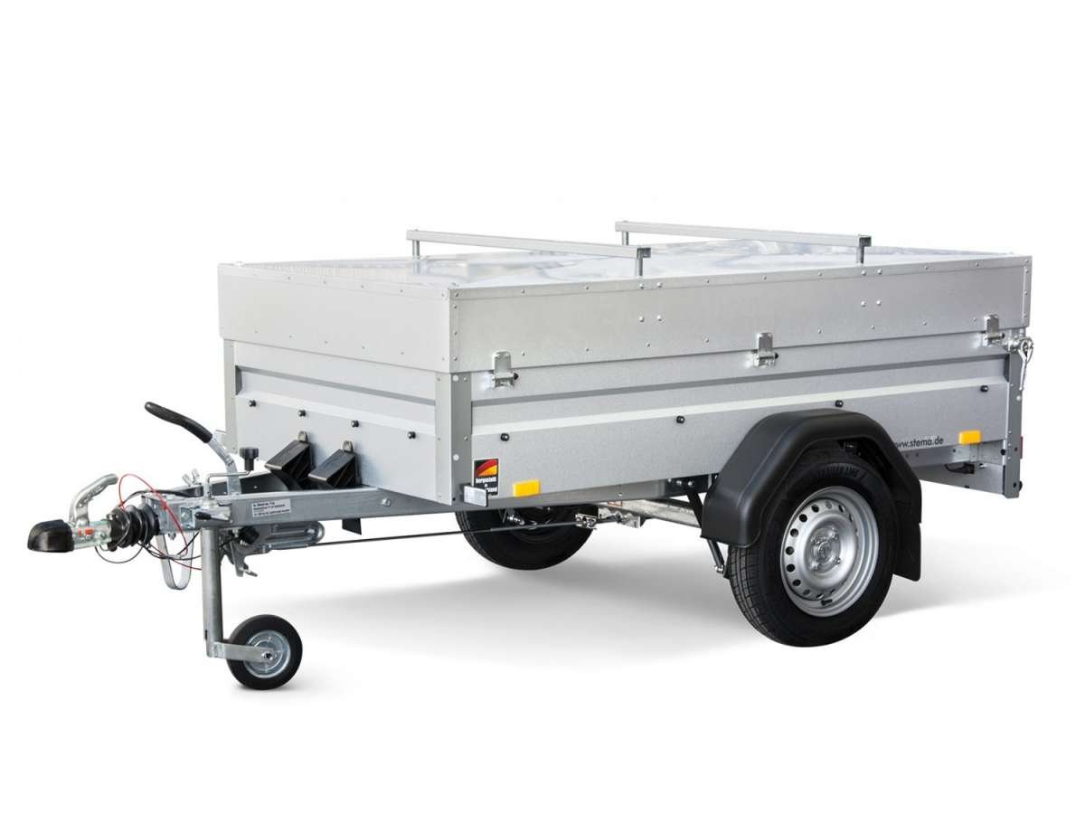 Châssis : version freinée avec amortisseurs pour une vitesse de 100 km/h, châssis de sécurité avec timon en V STEMA, cadre robuste en acier profilé galvanisé à chaud, essieu de torsion en caoutchouc avec roulements de roue compacts sans entretien, frein à inertie de fabrication allemande avec marche arrière automatique et roue jockey, indicateur de sécurité sur l’attelage à boule, éclairage de sécurité résistant aux chocs avec réflecteurs triangulaires intégrés et feu antibrouillard arrière.