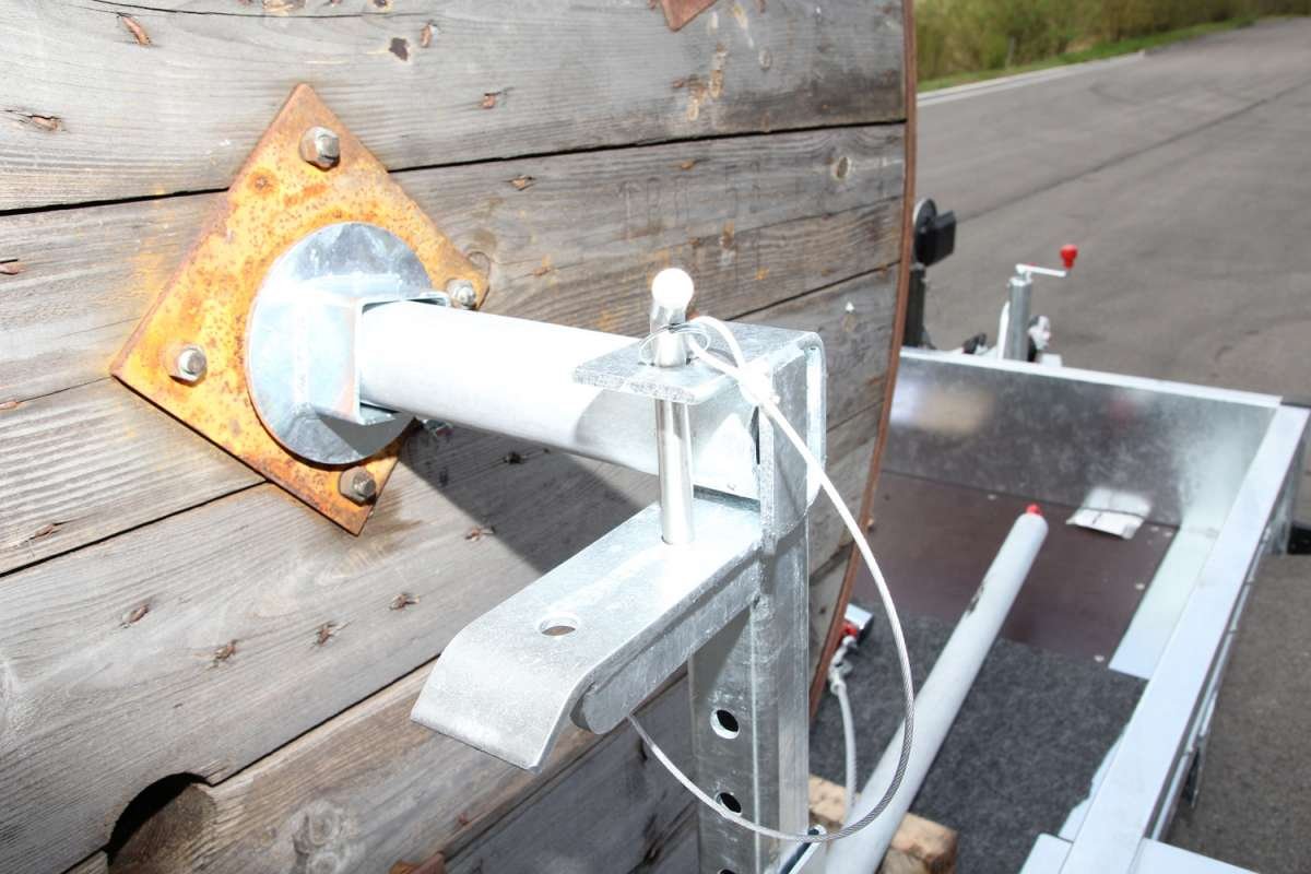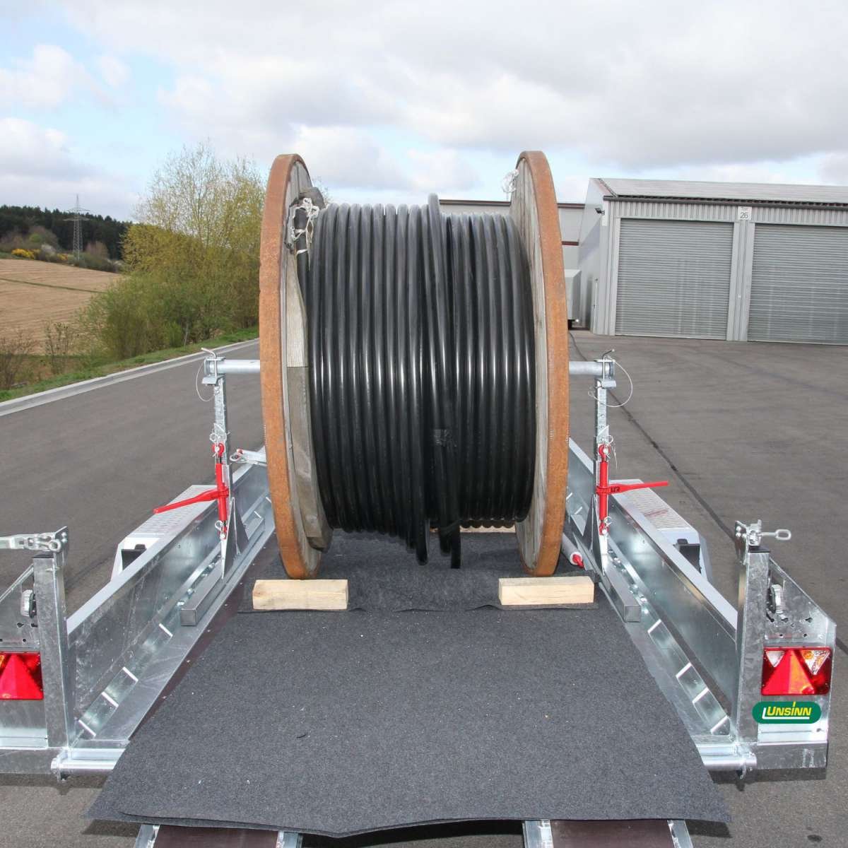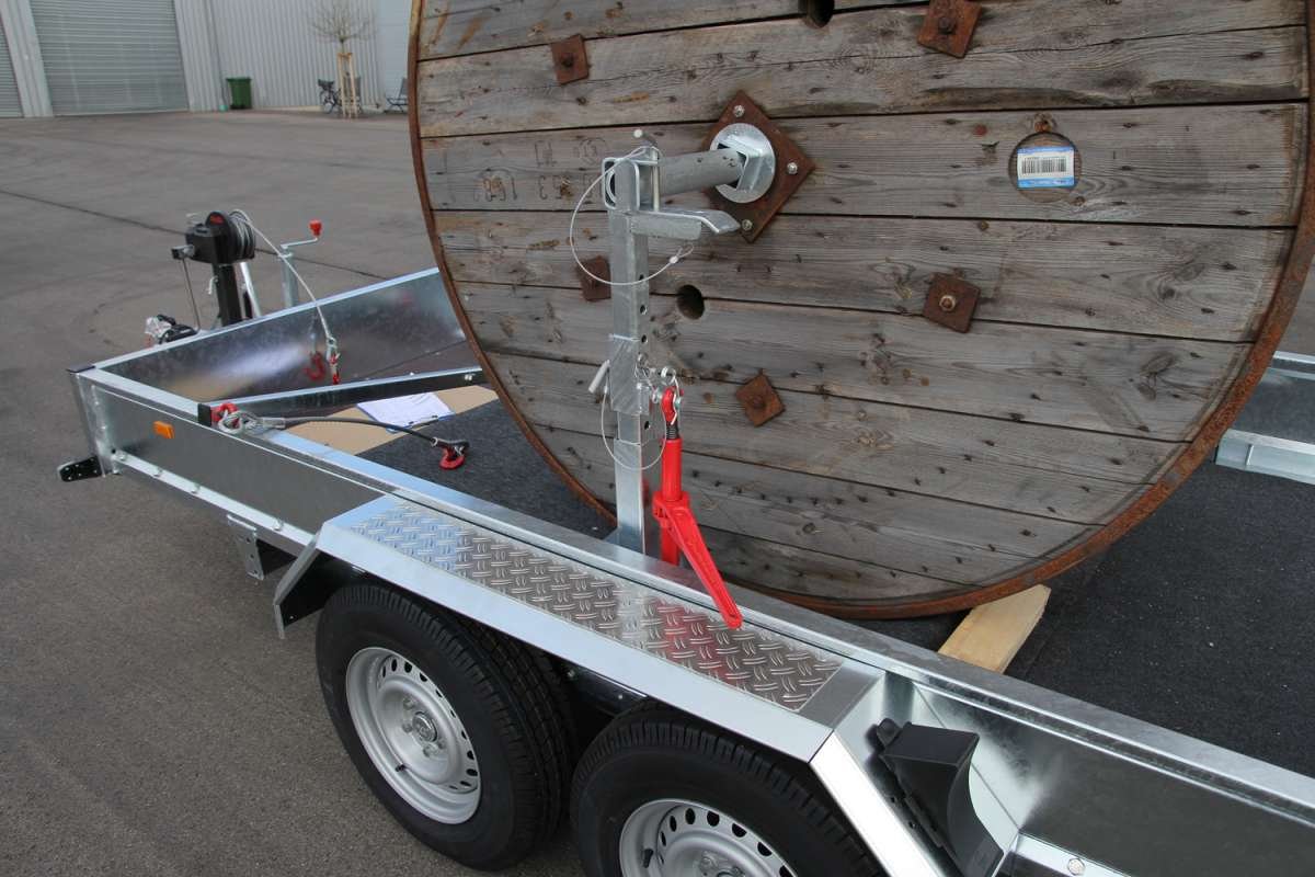 Support de tambour de câble avec cliquet, réglable en hauteur de 600 à 1000 mm environ, charge maximale 1500 kg, support de treuil pour treuil manuel de 900 kg, avec renfort de base vissé (poids de 155 kg réduisant la charge utile). Nouveauté : rampes latérales escamotables pour le chargement par chariot élévateur. Châssis :