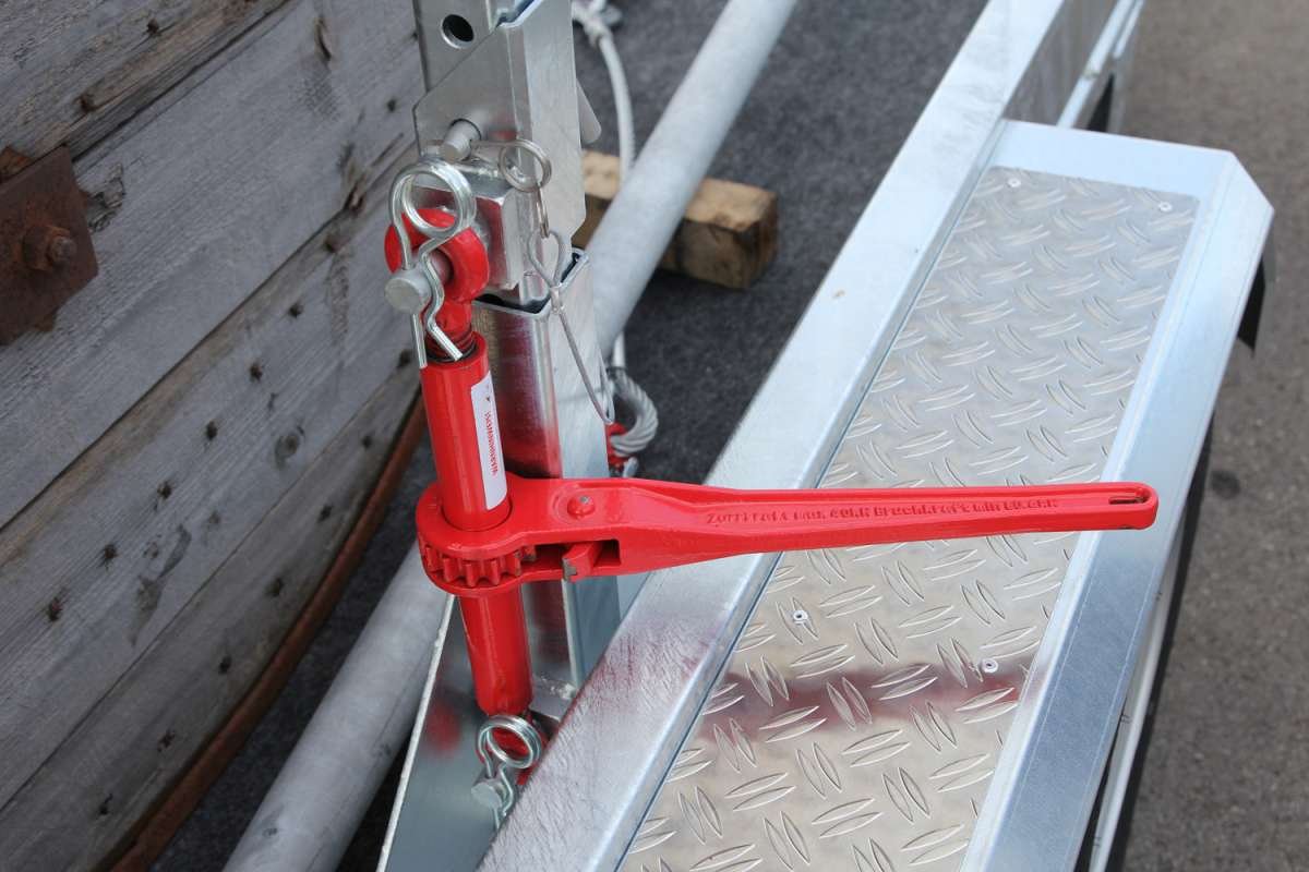 - 2 rampes de chargement pliables et réglables latéralement en aluminium avec support de sol intégré, d’une capacité de charge de 3500 kg