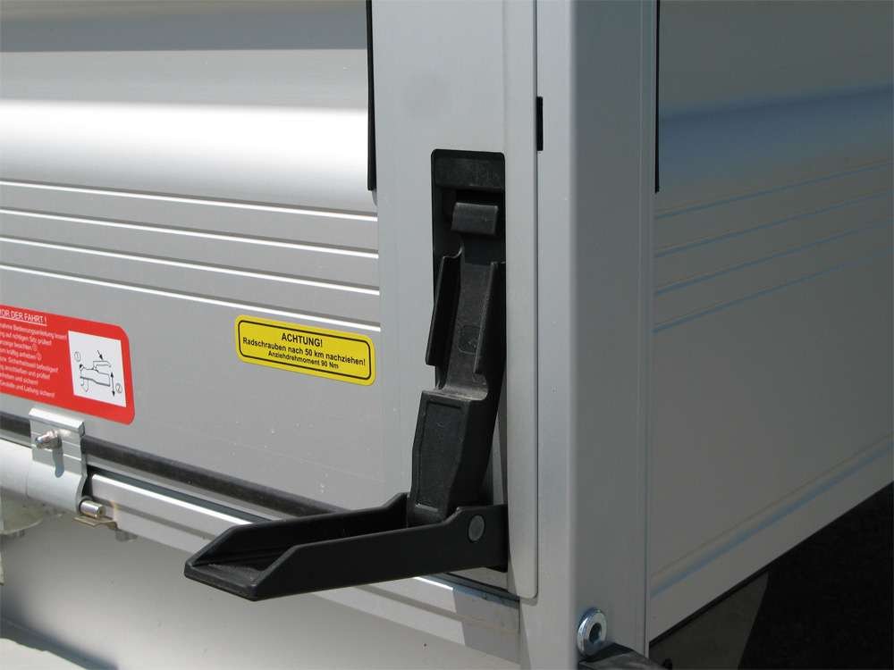 - 4 anneaux d’arrimage encastrés et rabattables, montés dans la paroi latérale, pour une fixation sûre du chargement.