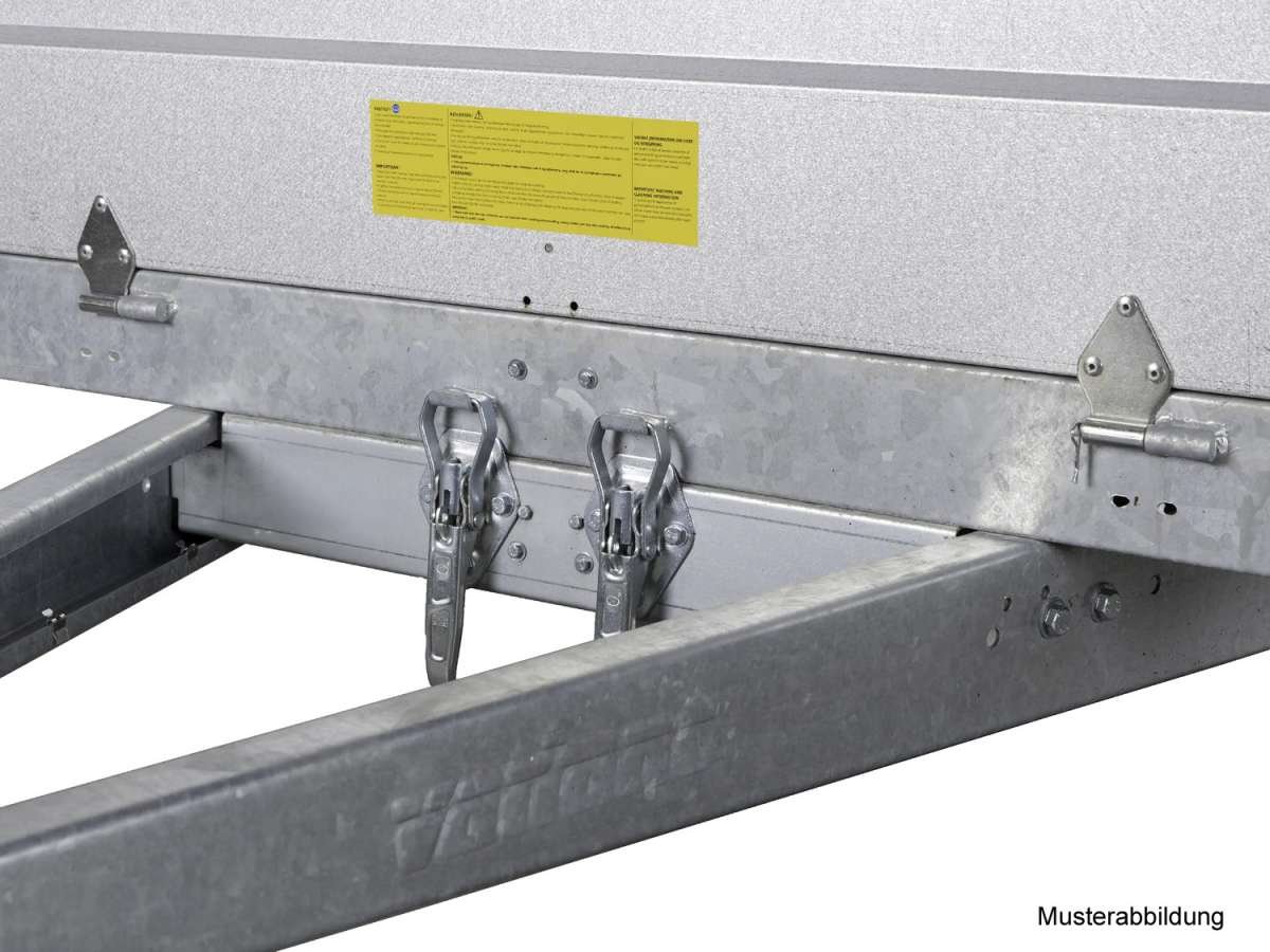 Les flancs en acier profilés assurent une stabilité optimale, tandis que le hayon renforcé, avec sa tôle d’aluminium striée et ses charnières, garantit une grande durabilité, même en cas d’utilisation intensive. Grâce à ses portes avant et arrière ouvrantes, la remorque offre un accès flexible des deux côtés, simplifiant ainsi les opérations de chargement et de déchargement.